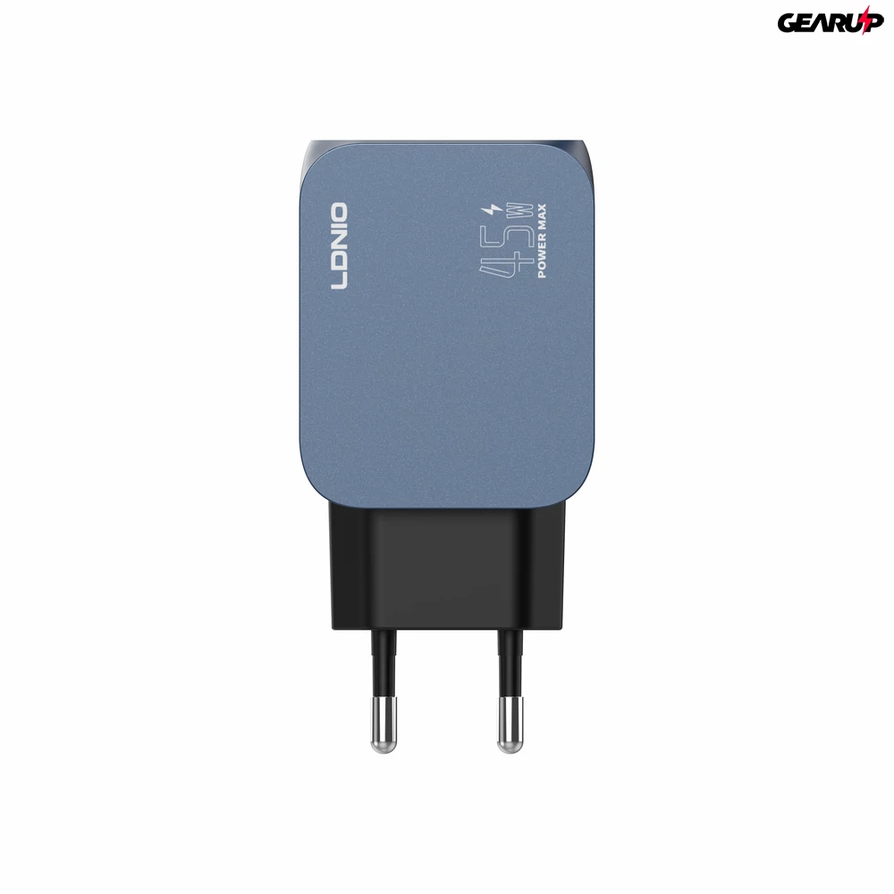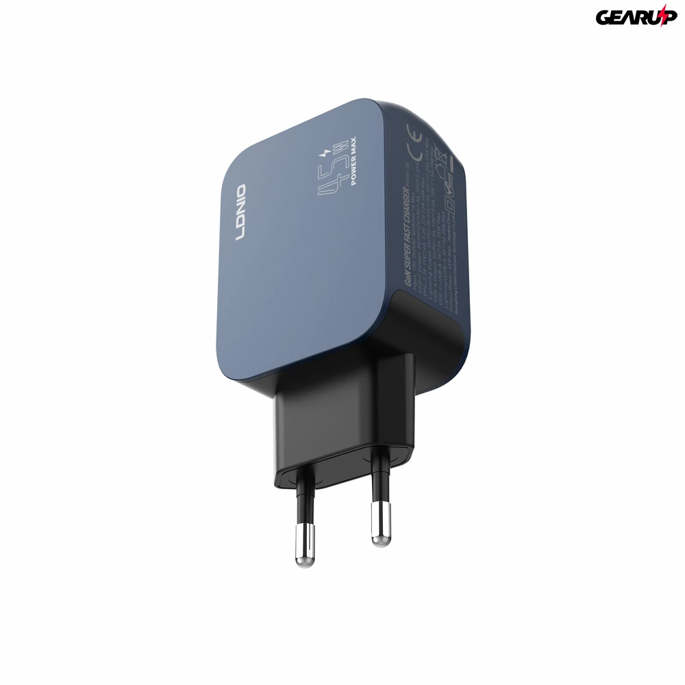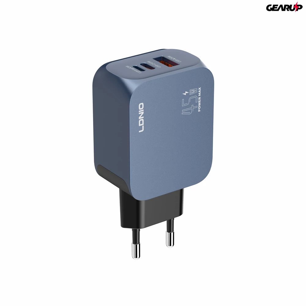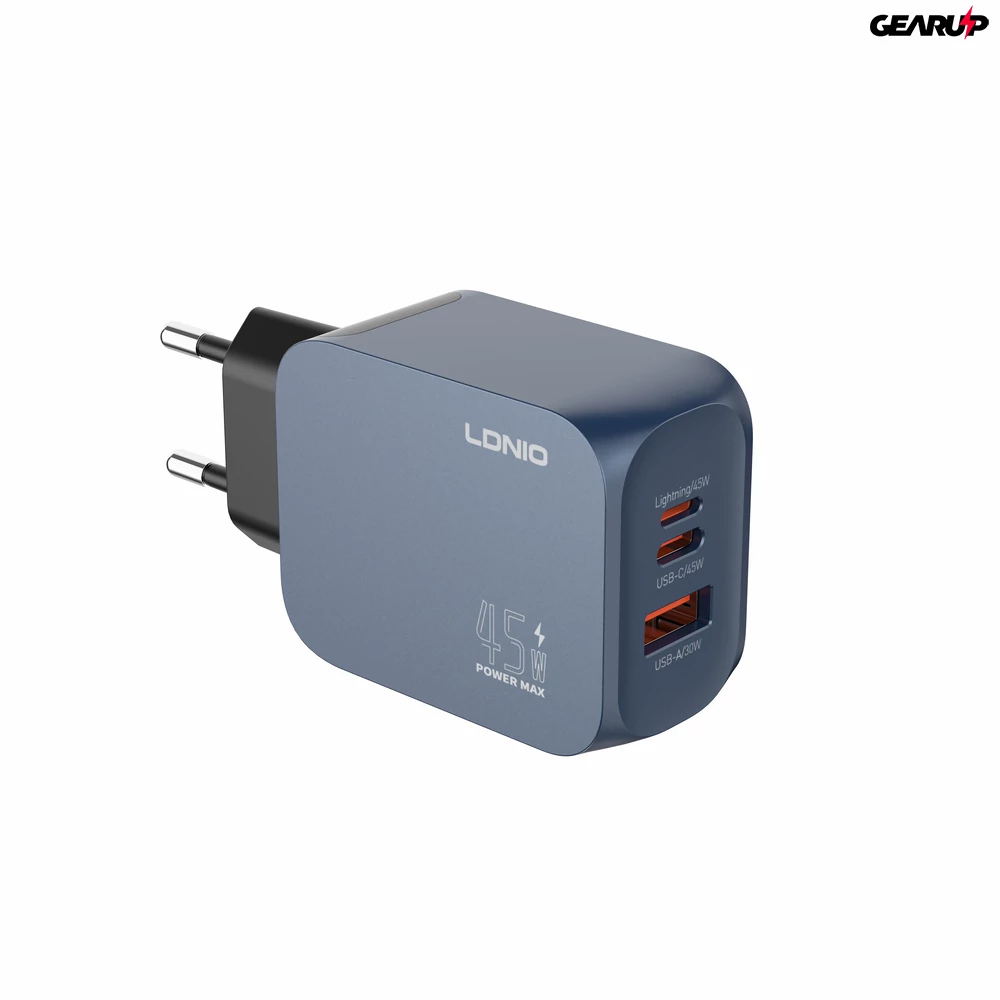Az LDNIO Q6 egy kék színű, EU csatlakozós GaN hálózati töltő, maximum 45 W teljesítménnyel. USB-C, Lightning és USB-A kimeneteivel egyszerűen kiszolgálja a különböző kábeleket és eszközöket egyetlen adapterből.