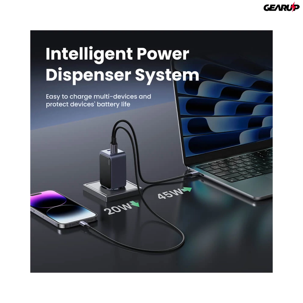- 2 eszköz: 45W (USB-C1) + 20W (USB-C2/USB-A)