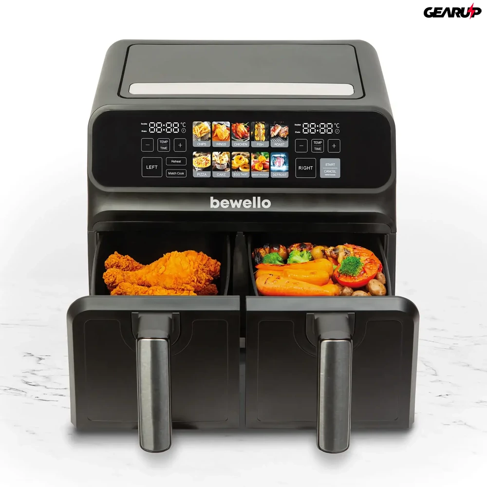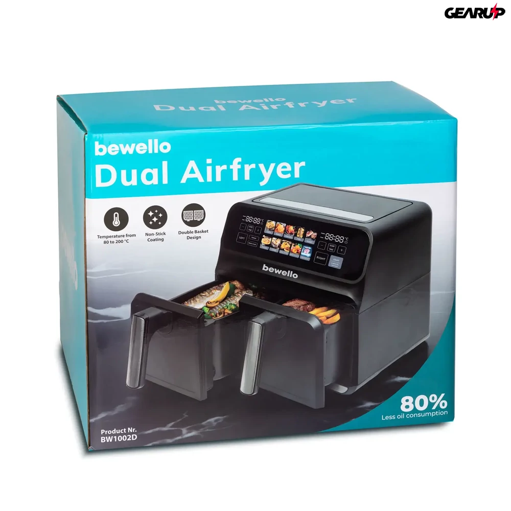 A Bewello BW1002D egyik legnagyobb előnye a két teljesen különálló, 4–4 literes sütőkosár. Ez lehetővé teszi, hogy például az egyikben hasábburgonya, a másikban csirkeszárny, zöldség vagy hal készüljön, így nem kell kompromisszumot kötnöd az idővel vagy az ízekkel. A két zóna külön szabályozható, így az eltérő sütési hőmérsékletet és időt igénylő fogások is gond nélkül, párhuzamosan készülhetnek el.